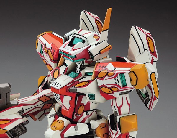 各部関節はポリパーツを使用した可動式。ひざ関節の可動に連動する、もも前面装甲のスライド可動を再現。J/V型用 頭部アンテナユニットを再現。マインドブースター展開可能。Vコンバーターの開閉は差し替え式。右手武器「デバイス FF-17」が付属。左手首は握りと、勝利ポーズ(敬礼)用の合計2種が付属。成形色は、本体はホワイト、ダークグレー、オレンジイエローの3色。クリアー部品は「クリアーグリーン」が付属。カスタム機「747-FF“テムジン[ファイアフライ]”」を再現するための塗装図とマーキングデカール(シルクスクリーン印刷)が付属。特典として、オールカラー12ページのCG集が付属。(h165×w296mm)デカールは発色の良いシルクスクリーン印刷です。〈CG集ページ構成〉表紙は747-FF。2~4ページまではファイアフライと破戒騎士の闘いをCGを交えつつ、ワタリ氏によるテキストで収録。5~6ページが白虹+武器、頭部、背面アップ。7ページがシャドウ。8~11ページが747AIIの1p~4pカラー。裏表紙は白虹です。