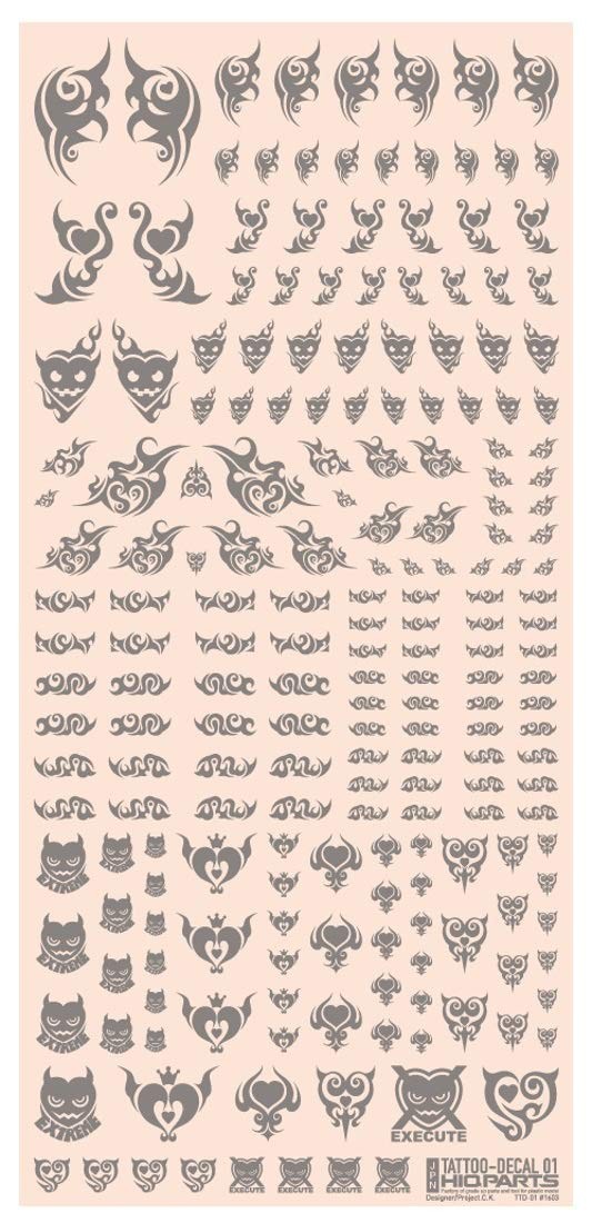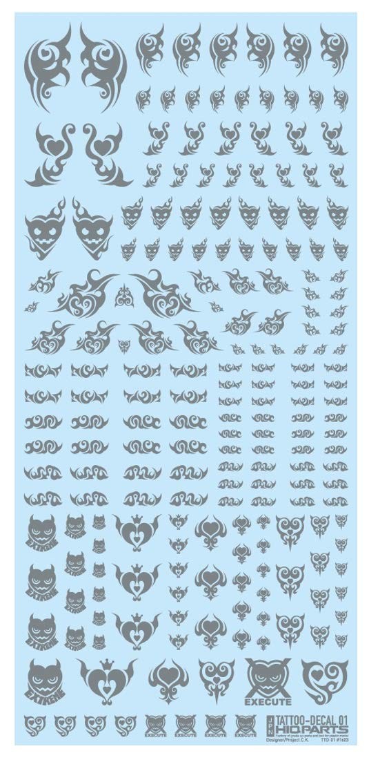 1/12フィギュアのカスタムアップ用タトゥーデカール3種にクリアホワイト・クリアブラックの2色が追加されます。