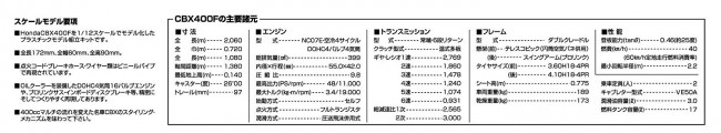 全長172mm、全幅60mm、全高90mm。点火コード・ブレーキホース・ワイヤー類はビニールパイプで再現されています。OILクーラーを装備したDOHC4気筒16バルブエンジンや、プロリンクサス・インボードディスクブレーキ等、精密にそしてつ<りやすく再現してあります。400ccマルチの流れを変えた名車CBXのスタイリング・メカニズムを味わって下さい。