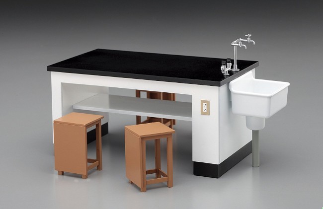 FAシリーズの第4弾は学校の理科室より、理科実験用作業机(水道蛇口・流し台・ガス栓付き)と木製椅子の組み立てキットが登場!