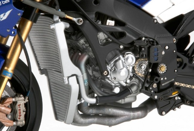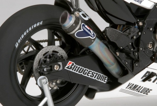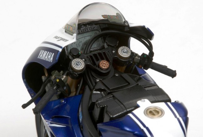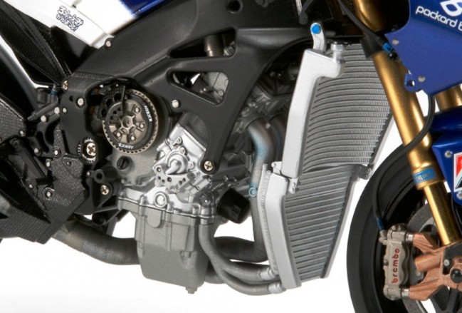 1/12スケールのプラスチックモデル組み立てキットです。全長172mm、全幅56mm。排気量800ccの並列4気筒エンジンやフレーム、前後サスペンションなど09年型のメカニズムを忠実に再現。前後16.5インチのスリックタイヤはソリッドゴム製。サイドカウルやシートカウルは極小ビスで取り付けられ、完成後も脱着可能。塗装用マスクシール付き。スライドマークはカルトグラフ社製。No.46とNo.99のマーキングをセット。アクセル、クラッチ、ブレーキなど各種のワイヤリングはビニールパイプで表現。タンクカバーも取り外し可能。レーシングスタンド付き。別売の人形セットと組み合わせて、サスペンションが沈み込んだコーナリング状態に組み立てられるパーツもセット。