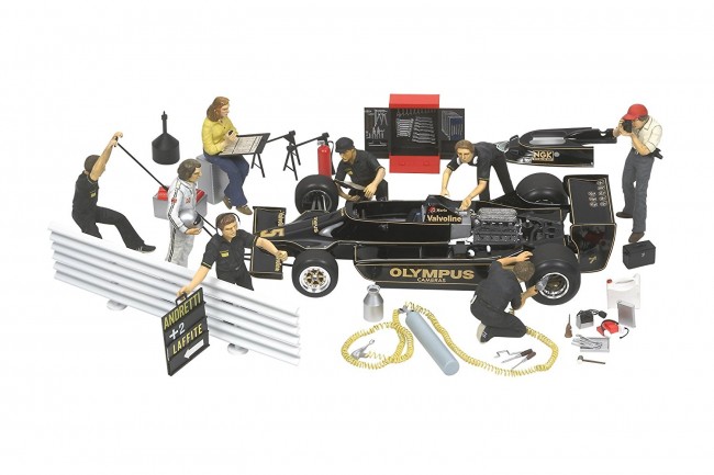 1/100秒を争うモータースポーツの世界。マシンを操るドライバーはもちろん、レーシングチームには様々なスタッフがその走りを支えています。ピットでの彼らの役割も様々。そんな1970年から1985年頃のピットレーンを再現できる人形セットです。1/20グランプリコレクションなどのカーモデルと組み合わせて、モデルをいっそう引き立て、臨場感あふれる情景作りが楽しめます。