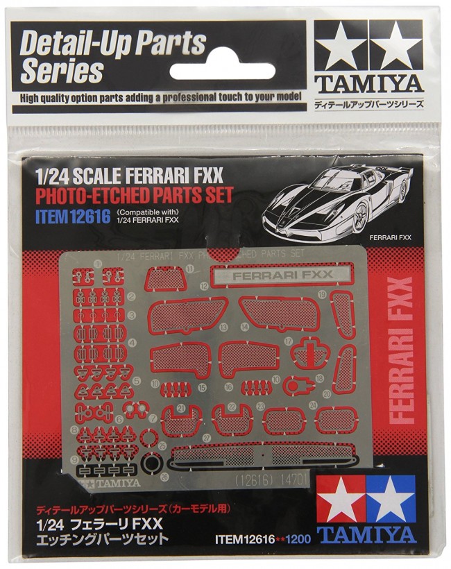 エッチングならではの繊細な表現がモデルの仕上がりを高めます。フロントエアインテーク用、リヤカウルのエアアウトレット用、ドア後部のエアインテーク用メッシュ、さらに牽引フックやボンネットピンなどのエッチングパーツをセット。加えて、室内の密度感を高めるエッチング製シートベルトバックルも付いています。エッチング製ネームプレート付き。