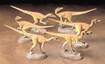 白亜紀末期にアジアから北アメリカにかけて広く生息した小型の肉食恐竜、ベロキラプトルを再現したプラスチックモデル組み立てキットです。口を開ける、飛びかかるなど3種類の基本スタイルに、3種類の手足を組み合わせることで、6体それぞれが異なったポーズで組み立てられ、集団で狩りをするシーンが楽しめます。小さいながらも、特徴的な後足の切り裂き用のツメまで再現しました。6体分のミニスタンド付き。