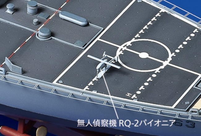 塔型の艦橋をはじめ、トマホークデッキ、ドーム型レーダー、甲板通風塔など湾岸戦争時の特徴をとらえてモデル化。対空レーダーや水上探査レーダー、艦首のディスコーンアンテナなどは成形品と、繊細なエッチング製の2種類を用意。張り線用のステンレス線をセット。16インチ砲1番砲塔は、後部のベンチレーターを別パーツで再現。後部甲板も専用パーツで無人偵察機RQ-2パイオニアもパーツ化。煙突横のクレーンや偵察機用発射台など専用のエッチングパーツもセット。1/1サイズの塗装用カラー図付き。B5版カラー16パージの実鑑解説資料集付き。