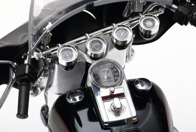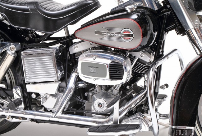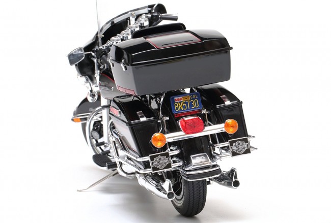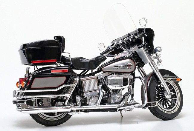 「キングオブザバイク」と呼ばれ、世界のオートバイファンのあこがれとなったのがハーレーダビッドソン社の最高級モデル、FLHクラシックです。デビューは1979年。それまで同社のトップモデルとなっていたFLH1200エレクトラグライドを基本に、各部をグレードアップしたデラックスバージョンとも言うべきもので、カラーリングをはじめ各部の仕上げはクラシカルなエレガントさを強調したものとなっていました。エンジンは、プッシュロッドとヘッドカバーの形状からショベルヘッドと呼ばれ、当時のオートバイ用としては世界最大級の排気量を誇る1340ccの空冷V型2気筒。全長は2.4m以上、重量は340kg以上にも達し、堂々とした風格はまさにキングの名にふさわしいものでした。なお、FLH80クラシックのボディカラーはツートーンが標準で、ブラックと暗いシルバーメタリックのツートーンの他に、クリームとブラウンのツートーンなども用意されました。