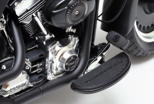 ハーレーダビッドソンの現行ラインナップ中、シンプルでマッチョなフォルムからベストセラーバイクとの呼び声も高いソフテイルファミリーの最新モデル「ファットボーイロー」の1/6スケール組み立てキット。実車を購入しての分解リサーチにより伝統のルックスと細部のディテールをあますところなく再現。魅力の中心となる1584cc空冷Vツインエンジンはシリンダーとシリンダーヘッドを積層組立て方式として、彫りの深い冷却フィンをシャープに再現。組み上がったシリンダーブロックを4本のスタッドボルトに合わせてクランクケースに載せるという実車同様の構造を楽しむ事が可能。ハンドルレバーは金属パーツで完成後も取り付け角度の調整が可能。ブレーキ、クラッチレバーも可動式。リヤサスペンションは2本のダンパーシリンダー内部にスプリングを内蔵して実車同様に可動。
