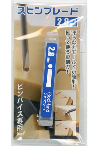 ナイフ・カッターなどです。 。 平らな丸モールドが簡単! 回して使う彫刻刀! スピンブレードは、ピンバイスに取り付けて使用する彫刻刀です。 ※刃物なので、蓋を開けるときや、ご使用する際は注意してお取り扱いください。 ・スピンブレードのおすすめの使い方をする場合には、グリップ付きのピンバイスや、同径のドリル刃がいります。 ・細かいタイプのディティールアップパーツがあるので、ドリル刃だと綺麗に入らないが、スピンブレードで作業を行えば綺麗な仕上がりになります。 彫刻刀としても、普通に使用することができます。 <使用時の注意> ※使い方を誤ると刃が欠けます。 回して使用する場合、下穴が必須です。 回転時は刃を押し付けず、自重のみで回して下さい。 ※素材の特性上、錆びが発生しますので、錆油をお塗りください。 (ゴッドハンド ウェブサイトより)