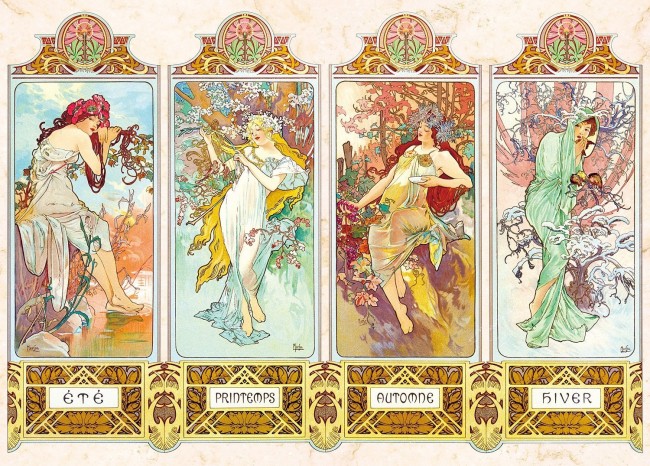 アール・ヌーボーの巨匠アルフォンス・ミュシャの代表作「季節の流れ」。完成サイズ:38x53cm