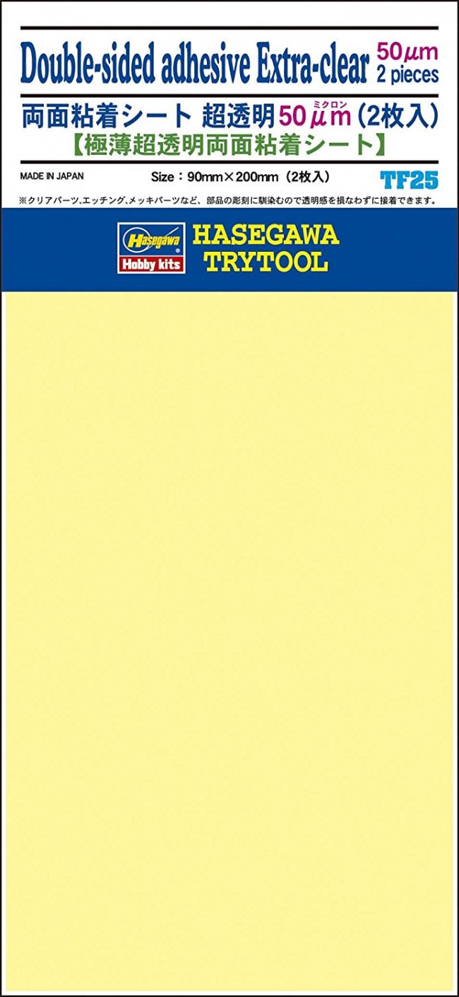 模型作りに適した極薄の糊を、台紙とペットフィルムでサンドイッチした、両面粘着シートです。糊の成分はフィニッシュシリーズと同等で、台紙からはがした後に約24時間で固着します。