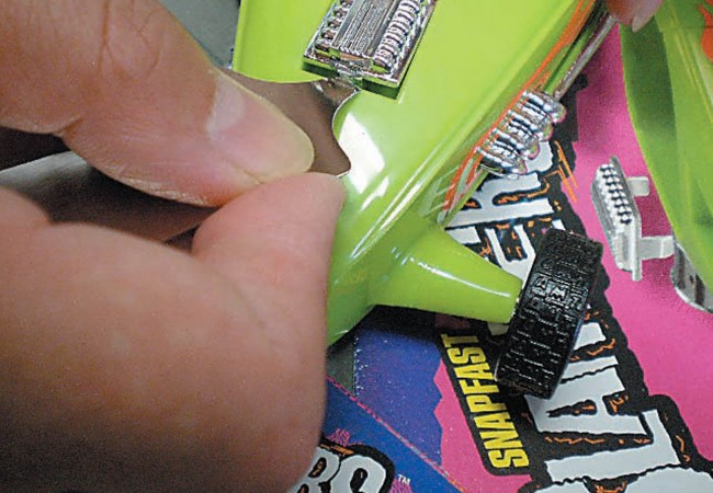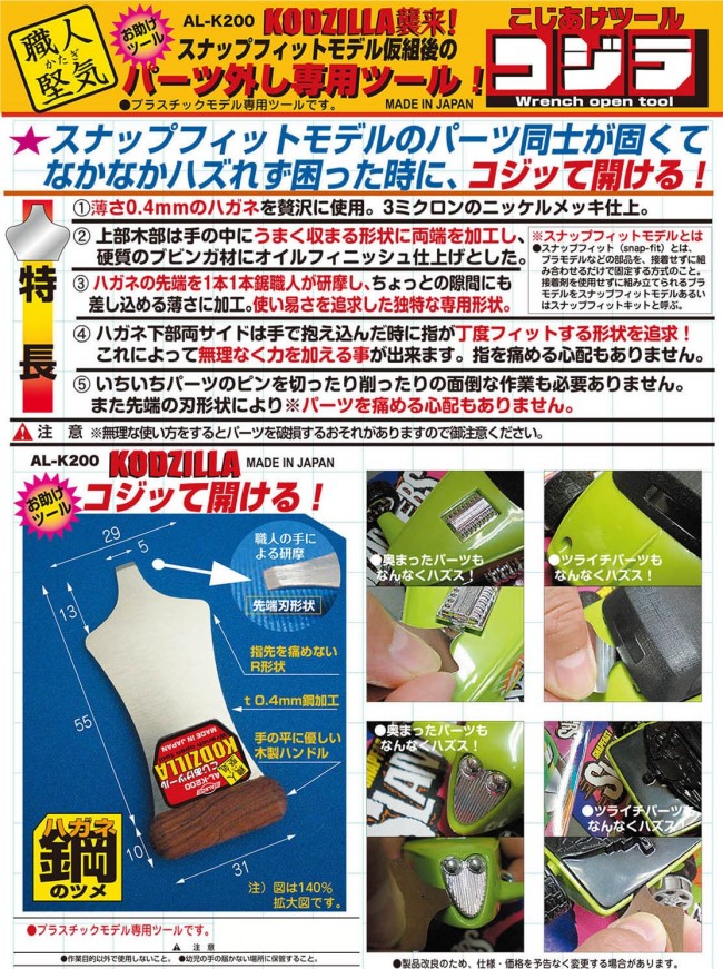モデリング用/モデリング補助ツール 等 スナップフィットモデルのパーツ同士が固くてなかなかハズれず困った時に、コジッて開ける! ①薄さ0.4mmのハガネを贅沢に使用。 3ミクロンのニッケルメッキ仕上。 ②上部木部は手の中にうまく収まる形状に両端を加工し、硬質のブビンガ材にオイルフィニッシュ仕上げとした。 ③ハガネの先端を1本1本鋸職人が研摩し、ちょっとの隙間にも 差し込める薄さに加工。 使い易さを追求した独特な専用形状。 ④ハガネ下部両サイドは手で抱え込んだ時に指が丁度フィットする形状を追求! これによって無理なく力を加える事が出来ます。 指を痛める心配もありません。 ⑤いちいちパーツのピンを切ったり削ったりの面倒な作業も必要ありません。 また先端の刃形状により※パーツを痛める心配もありません。 注意 ※無理な使い方をするとパーツを破損するおそれがありますので御注意ください ※スナップフィットモデルとは ●スナップフィット (snap-fit) とは、プラモデルなどの部品を、接着せずに組み合わせるだけで固定する方式のこと。 接着剤を使用せずに組み立てられるプラモデルをスナップフィットモデルあるいはスナップフィットキットと呼ぶ。 製品サイズ 全長65mm ●製品改良の為、仕様・価格を予告なく変更する場合がございます。あらかじめご了承ください。 【企画】株式会社 シモムラアレック http://shimomura-alec.co.jp 【販売】有限会社 プラッツ http://www.platz-hobby.com/