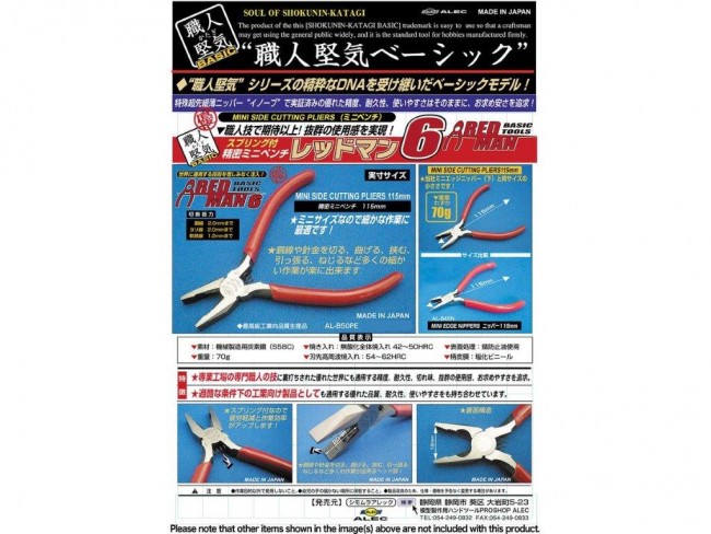 ■専業工場の専門職人の技に裏打ちされた優れた世界にも通用する制度、耐久性、切れ味、 抜群の使用感、お求めやすさを追求 ■過酷な条件下の工業向け製品としても通用する優れた品質、耐久性、切れ味、使いやすさを 持ち合わせています。 ■銅線や針金を切る、曲げる、挟む、引っ張る、ねじるなど多くの細かい作業が楽にできます。 製品サイズ 全長:115mm ●製品改良の為、仕様・価格を予告なく変更する場合がございます。あらかじめご了承ください。 【企画】株式会社 シモムラアレック http://shimomura-alec.co.jp 【販売】有限会社 プラッツ http://www.platz-hobby.com/