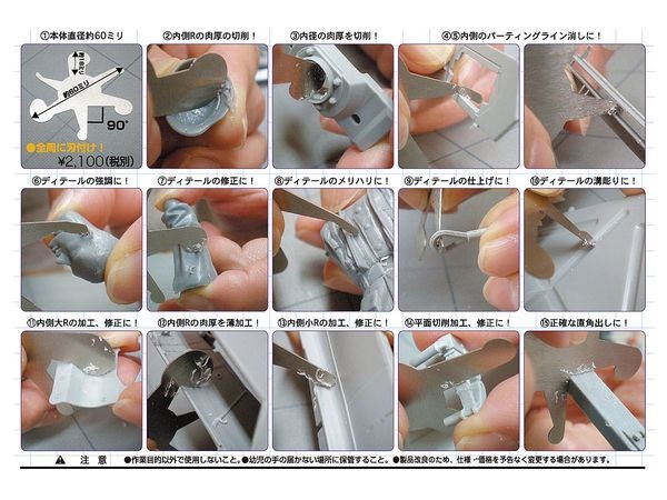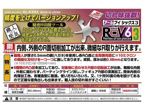 精度を上げてバージョンアップ! このR-V6は今まで難しかった精密な内側、外側のR面切削加工を可能としました。 内側、外側のR面切削加工が出来、微細なR取りが行えます。 6種類のR凸部を加工しており、対象物に 合わせたR部の切削加工が出来、微細な内側、外側に関わらずパーティングライン消し、フィギュアR部の深溝加工、筒体内側の肉薄加工他、各種造型に最適。使い方もいろいろ。 また、1ヶ所90度の角を設けてあるので正確な直角出しも出来ます。 職人技の切れ味がすごくいい! 製品サイズ:直径60mm