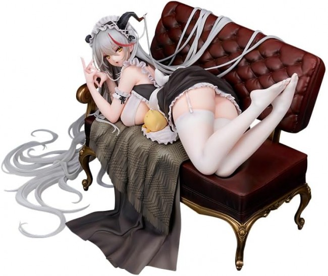 『アズールレーン』より、“エーギル”が登場! 「鉄血母港のメイドラッヘ」の衣装で立体化しました。 ソファに寝そべり、挑発的な眼差しを向けた姿が魅力的。 グラマラスなプロポーションも丁寧に再現され、肌の陰影やニーハイの透け塗装も相まって肉感豊かな出来栄えです。 スーパーロングの髪の毛は、細やかな毛束の造形や毛先のニュアンス表現により密度感を高めます。 クラシカルなソファは、深みのある彩色により高級感を演出。 お腹のマスコットのフォルムもチャームポイントです。 メイド服のスカートは着脱可能です。 ●スカートは着脱可能 1/7スケール PVC&ABS製塗装済完成品 【アズールレーン エーギル 鉄血母港のメイドラッヘVer. 】 ■全長:約290mm ■専用ベース付属 ■原型:jarel/原型協力:アルター ■彩色:かわも【エーギル+マスコット】ぱこまる【ソファ】 (C) 2017 Manjuu Co.,Ltd. & YongShi Co.,Ltd. All Rights Reserved. (C) 2017 Yostar, Inc. All Rights Reserved. ※写真は試作品です。実際の製品とは若干異なります。 ※製品の仕様は予告なく変更する場合があります。ご了承ください。