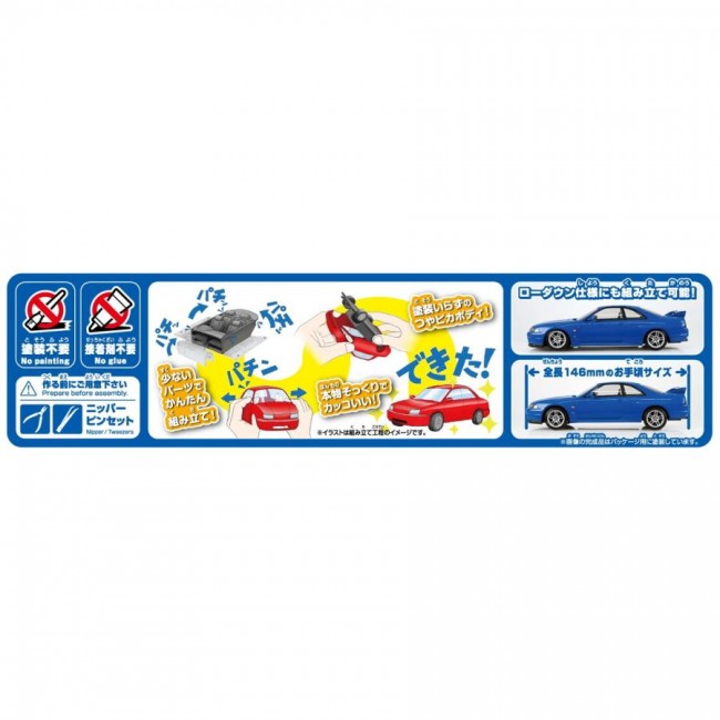 GT-Rと言えばR33型!? 近年、その存在が見直されているR33型 GT-Rを最高のフォルムで再現!! ・パーツ点数25点のお手軽モデル ・選択式でローダウン仕様にも組み立て可能 ・ボディカラー:ブルー ■塗装不要 ボディ色をプラスチック材料の着色で再現する事により、塗装不要となりました。 ツヤツヤのボディも見どころです。 ■接着剤不要 はめ込み式を採用する事で接着剤が不要となりました。 ■少ないパーツで高い再現性 キットを簡略化しながらも1/32スケールで高い再現性を実現しました。 ※画像は試作品です。実際の商品とは異なる場合がございます。 ※ローダウン仕様で組み立てた場合、タイヤが回転しにくい場合があります。 ※日産自動車(株)申請中 [プラモデル] ブランド AOSHIMA シリーズ 楽プラ スナップキット No.21-BE スケール 1/32 (青島文化教材 ウェブサイトより)