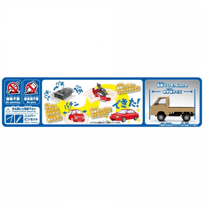 軽トラだってオシャレしたい! <金型追加> 「農道のポルシェ」としても名高いRR駆動車、スバル サンバーをリアルな出来栄えでプラモデル化。 今回はカスタムホイール仕様の追加となります。 選択式でノーマル車高にも組み立て可能です。 ・パーツ点数26点のお手軽モデル ・塗り分けの必要な部分はシールで再現 ・選択式でノーマル車高にも組み立て可能 ・ボディカラー:No.05CU-BG ブルーグレー ・ホイールカラー:メッキ ■塗装不要 ボディ色をプラスチック材料の着色で再現する事により、塗装不要となりました。 ツヤツヤのボディも見どころです。 ■接着剤不要 はめ込み式を採用する事で接着剤が不要となりました。 ■少ないパーツで高い再現性 キットを簡略化しながらも1/32スケールで高い再現性を実現しました。 ※画像は試作品です。実際の商品とは異なる場合がございます。 ※この商品はプラモデルキットです。組み立てには別途、工具等が必要です。 ※車種によりホイールカラーが異なりますのでご注意ください。 ※(株)SUBARU申請中 [プラモデル] ブランド AOSHIMA シリーズ 楽プラ スナップキット No.05CU-KI スケール 1/32 (青島文化教材 ウェブサイトより)