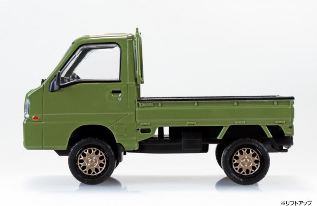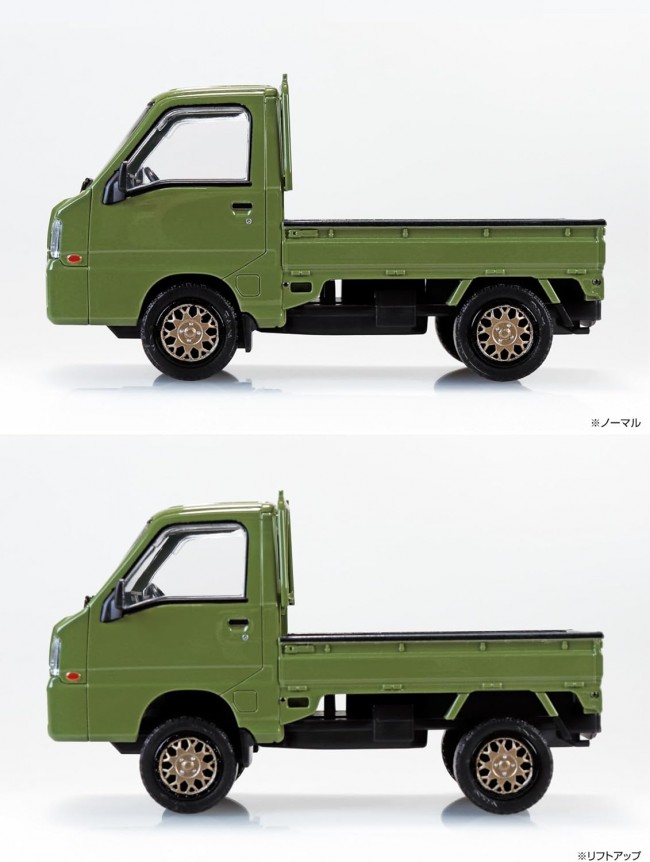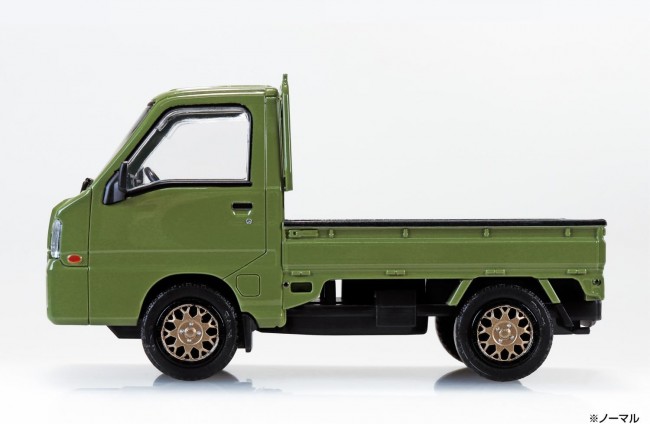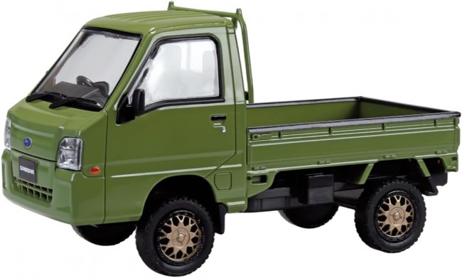 軽トラだってオシャレしたい! <金型追加> 「農道のポルシェ」としても名高いRR駆動車、スバル サンバーをリアルな出来栄えでプラモデル化。 今回はカスタムホイール仕様の追加となります。 選択式でノーマル車高にも組み立て可能です。 ・パーツ点数26点のお手軽モデル ・塗り分けの必要な部分はシールで再現 ・選択式でノーマル車高にも組み立て可能 ・ボディカラー:No.05CU-OG オリーブグリーン ・ホイールカラー:ブロンズ ■塗装不要 ボディ色をプラスチック材料の着色で再現する事により、塗装不要となりました。 ツヤツヤのボディも見どころです。 ■接着剤不要 はめ込み式を採用する事で接着剤が不要となりました。 ■少ないパーツで高い再現性 キットを簡略化しながらも1/32スケールで高い再現性を実現しました。 ※画像は試作品です。実際の商品とは異なる場合がございます。 ※この商品はプラモデルキットです。組み立てには別途、工具等が必要です。 ※車種によりホイールカラーが異なりますのでご注意ください。 ※(株)SUBARU申請中 [プラモデル] ブランド AOSHIMA シリーズ 楽プラ スナップキット No.05CU-OG スケール 1/32 (青島文化教材 ウェブサイトより)
