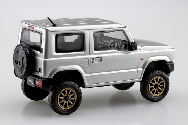 リフトアップのカスタム仕様、大迫力ジムニー!  軽自動車規格の本格オフローダー「スズキ ジムニー」が4代目へとフルモデルチェンジして2018年に登場しました。 「本格的な4WD性能と無駄のない機能美を併せ持つ、世界に認められるコンパクト4×4」をコンセプトに開発され、基本構造を継承しつつ車体の要となるラダーフレームの新規開発や、R06Aエンジンへのスイッチなどが行われています。 角ばったボディーフォルムは「プロの道具」をテーマとしてデザインされ、視界の広さの確保や積載量の向上といった機能性だけではなく、快適な居住性を併せ持つことができ日常の使いやすさも追及されています。  ・パーツ点数31点のお手軽モデル ・塗り分けの必要な部分はシールで再現 ・ノーマル車高にも組み立て可能 ・ボディカラー:No.09CU-SS シルキーシルバーメタリック ・ホイールカラー:ブロンズ  ※画像は試作品です。実際の商品とは異なる場合がございます。 ※この商品はプラモデルキットです。組み立てには別途、工具等が必要です。 ※車種によりホイールカラーが異なりますのでご注意ください。 ※スズキ(株)監修中  [プラモデル] ブランド AOSHIMA  シリーズ 楽プラ スナップキット No.09CU-SS  スケール 1/32  (青島文化教材 ウェブサイトより)