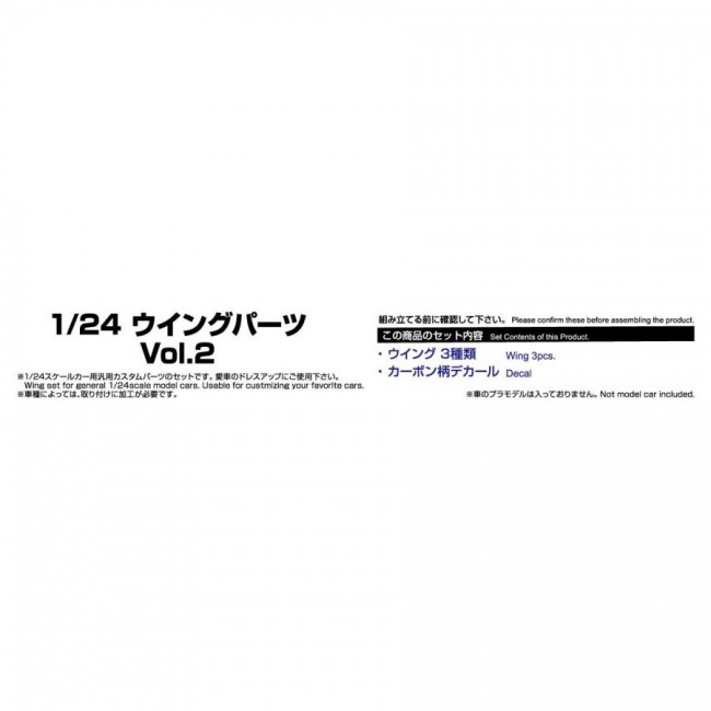 【スケール】1/24  愛車をよりスポーティに  ザ☆チューンドパーツに、汎用性の高いウイングパーツセットが加わります。  ●各3種類ずつリアウイングが入ったお得なセット ●お好みの場所へ貼れるカーボンデカール付属  ※取り付けの際は加工が必要になる場合がございます。