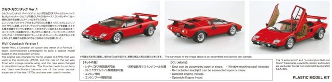 プラモデル 【スケール】1/24 ワンオフのスペシャルなカウンタック F1チームのオーナー「ウォルター・ウルフ」がランボルギーニへ特別に製作を依頼したカウンタック。 エンジンは5リッターに換装され、リアウイングやオーバーフェンダーなどの専用エクステリアも装着。 ●エンジン再現 ●エンジンフード開閉可能 ●リトラクタブルヘッドライト開閉選択可能 ●ドアは開いた状態も再現可能 ●色分けテールライト
