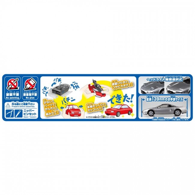 プラモデル 【スケール】1/32 ホンダが誇る国産スーパーカー 【製品説明】 憧れの国産スーパーカーを手軽にあなたのお手元に 〈完全新金型〉 ・パーツ点数32点のお手軽モデル 【楽プラ スナップキットとは】 ・塗装不要 ボディ色をプラスチック材料の着色で再現する事により、塗装不要となりました。 ツヤツヤのボディも見どころです。 ・接着剤不要 はめ込み式を採用する事で接着剤が不要となりました。 ・少ないパーツで高い再現性 キットを簡略化しながらも1/32スケールで高い再現性を実現しました。 ボディカラー:No.19-SS セブリングシルバー