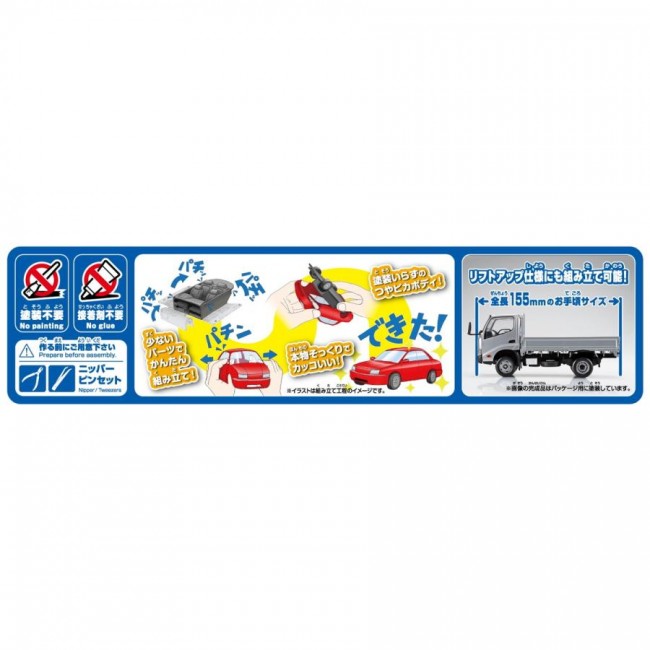 ──ヒノの2トン 楽プラの「はたらく車」初の2トン車、日野デュトロ 低床 平トラックが登場します。 ボディ形状は勿論のこと、ボディ下部フレームの装備もリアルに再現しました。 パーツ数を抑え、塗装不要・接着剤不要。お子様から大人まで楽しめるプラモデルです。 ・パーツ点数35点のお手軽モデル ・塗り分けの必要な部分はシールで再現 【楽プラ スナップキットとは】 ・塗装不要:ボディ色をプラスチック材料の着色で再現する事により、塗装不要となりました。ツヤツヤのボディも見どころです。 ・接着剤不要:はめ込み式を採用する事で接着剤が不要となりました。 ・お手頃価格:キットの簡略化と1/32スケールとする事でお手頃価格を実現しました。 スケール:1/32 ボディカラー:No.23-SR シルバー ※画像は3D設計図に着色したものです。実際の商品とは異なる場合がございます。