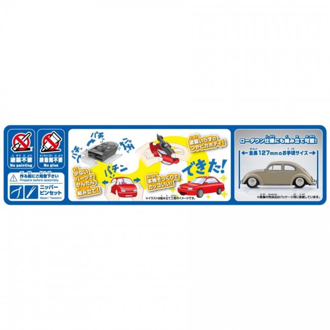 世界中で愛されたクルマ 約70年に渡り世界中で愛されたベストセラーカーの1955年式「オーバル」と呼ばれる世代をモデル化 ・パーツ点数32点のお手軽モデル ・ボディカラー:ライトベージュ ■塗装不要 ボディ色をプラスチック材料の着色で再現する事により、塗装不要となりました。 ツヤツヤのボディも見どころです。 ■接着剤不要 はめ込み式を採用する事で接着剤が不要となりました。 ■少ないパーツで高い再現性 キットを簡略化しながらも1/32スケールで高い再現性を実現しました。 ※画像は3D設計図に着色したものです。実際の商品とは異なる場合がございます。 Trademarks, design patents and copyrights are used with the approval of the owner Volkswagen AG. [プラモデル] ブランド AOSHIMA シリーズ 楽プラ スナップキット No.20-LB スケール 1/32 【初回生産分にのみ付属の特典】 つながる!ジオラマペーパークラフト (青島文化教材 ウェブサイトより)