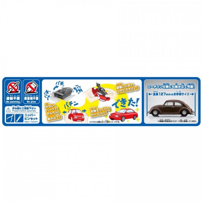 プラモデル 【スケール】1/32  【製品説明】 ・1938年に生産が開始されたフォルクスワーゲンの「ビートル」 ・通称「オーバル」と呼ばれるモデルを再現 ・パーツ点数32点のお手軽モデル  【楽プラ スナップキットとは】 ・塗装不要 ボディ色をプラスチック材料の着色で再現する事により、塗装不要となりました。 ツヤツヤのボディも見どころです。 ・接着剤不要 はめ込み式を採用する事で接着剤が不要となりました。 ・少ないパーツで高い再現性 キットを簡略化しながらも1/32スケールで高い再現性を実現しました。  ボディカラー:No.20-TB テキサスブラウン