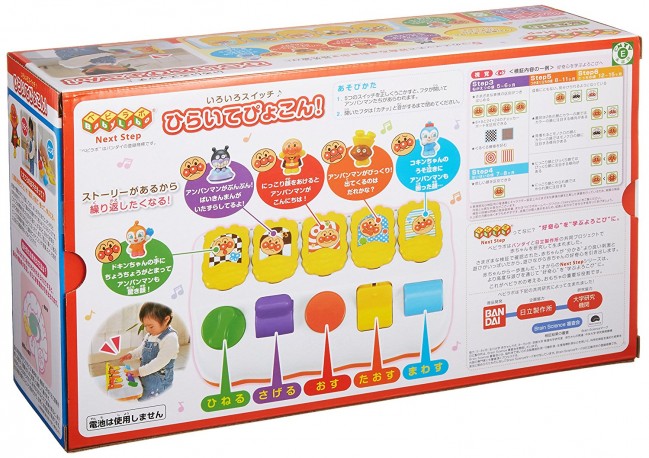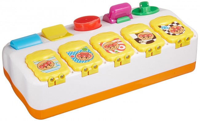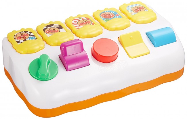 「ひねる」「さげる」「おす」「たおす」「まわす」の5つのスイッチで指先の練習! 「ひねる」とドキンちゃん、「さげる」とばいきんまん、「おす」とアンパンマン、「たおす」とカレーパンマン、「まわす」とコキンちゃんたちがのフタに描かれたアンパンマンの表情に合わせて出てきてお子さまの興味を引き出す!サイズ:W275×H70×D155mm