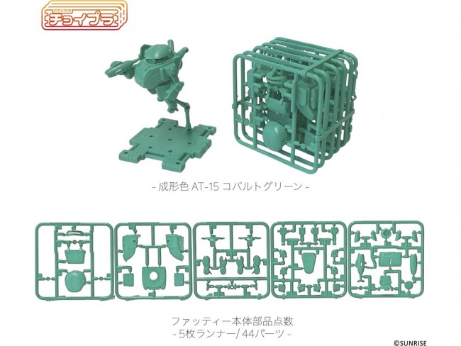 【チョイプラ ファッティー】 ・商品仕様:インジェクションプラキット ・スナップフィット式 ・材質:PS ・部品数:44パーツ(5枚ランナー) ・成形色: AT-15 コバルトグリーン ・ディスプレイベース付き 1枚ランナー(8パーツ) ・ノンスケール ・サイズ:約47mm(頭頂高)