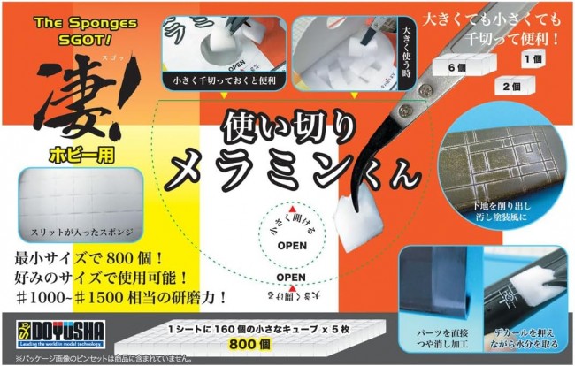 デカールを抑えながら水分を取ったり、軽い研磨で汚し塗装を再現したり! 使い切りのメラミンスポンジが新登場!スリットが入ったメラミンスポンジはバラして使えば1シートが160個のキューブに変身。 1個ずつにバラすも良し、 2~6個など、用途に合わせて大きさを変えられる! バラしておけば、天面の取り出し口からサッと摘まんで使いやすさアップ! ■1シート(キューブ160個)×5枚 ■シートサイズ:100×160×10mm