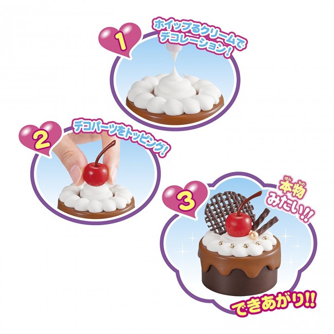 本物みたいなホイップるクリームをしぼって、かわいいスイーツつくっちゃお! もこもこかわいいスイーツが5個作れるよ!