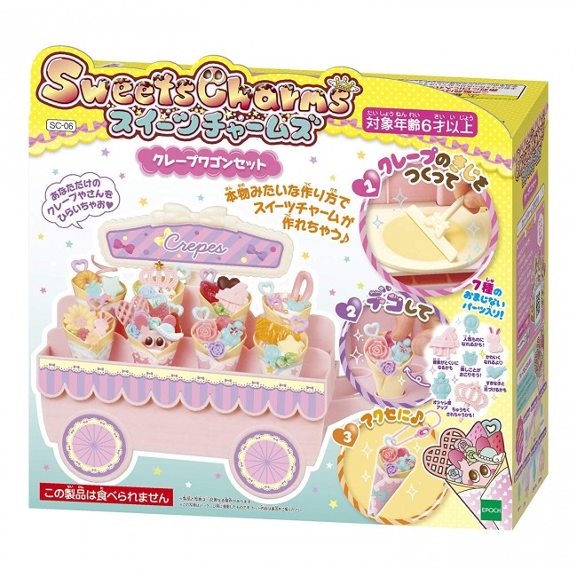 付属のヘラを使ってクレープ生地を作り、くるっと丸めてクリームをしぼったら、おまじないパーツやデコパーツ、ビーズでデコレーションして完成です。