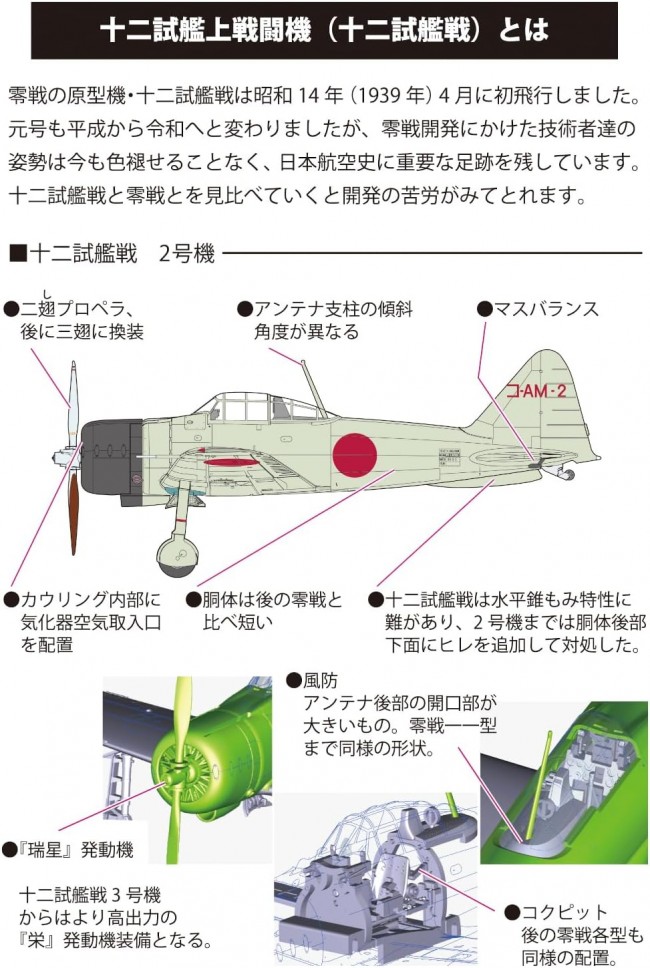 零式艦上戦闘機(ゼロ戦)のプロトタイプである「十二試艦戦」1号機・2号機は、後に零戦の心臓部となる「栄エンジン」ではなく、三菱製「瑞星エンジン」を搭載し、2枚プロペラを備える点が最大の特徴です。 さらに、制式採用後の零戦とは一線を画す多数のディテールが存在します。 わずかに短い胴体、独特なカウリング形状、前傾したアンテナ支柱、異なる垂直尾翼の輪郭、胴体後部下に装備されたフィン、突出型マスバランス付きの水平尾翼など、細部にわたって異なる試作機ならではの姿が確認できます。 本キットでは、十二試艦戦「2号機」の仕様に基づき、零戦とは異なる各部ディテールを丹念に再現。 零戦と並べて展示すれば、開発過程の違いが一目でわかる視覚的な比較が可能です。 胴体・翼・エンジン・プロペラはグレー、脚部はブラック、機体内部は黄緑の3色成形を採用します。 シリーズ名 1/72 スケール 日本陸海軍 航空機