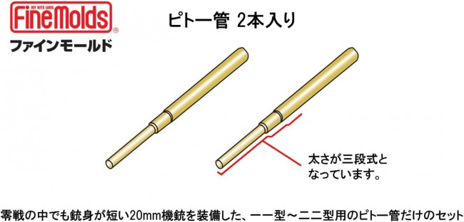 ファインモールド製1/48スケール零式艦上戦闘機用の真ちゅう製挽き物ピトー管です。 零戦の中でも20mm機銃の銃身が短い、一一型~二二型用にピトー管だけをセットにした製品です。 金属製ならではのシャープさ、強度を持ち、当社のキットに無加工で取り付けることができるよう長さを調整し、日本海軍ピトー管の特徴である太さが3段式となっている点を再現しています。 2機分入。 (※主翼から20mm機銃が突出している二二型甲、五二型以降は別製品のAC93 零戦用20mm機銃&ピトー管セットをお使いください。) シリーズ名 1/48 スケール 日本陸海軍 航空機