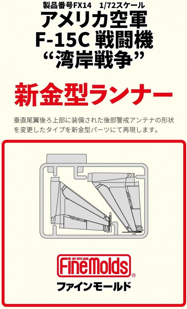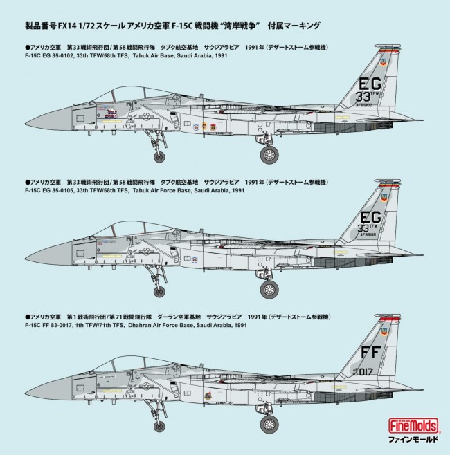 1990年8月イラク軍がクウェートに侵攻すると、即座にアメリカを中心とした欧米諸国が対抗策を打ちだし中東にむけて軍が移動します。 イラク軍に撤退期限を通告し砂漠の盾作戦が開始されました。 米空軍はまず第1戦術飛行団(1TFW)の第71飛行隊(71TFS)のF-15Cをサウジアラビアに展開します。 この部隊が砂漠の盾作戦を支援するために上陸した最初の米軍戦闘部隊です。 ほか第33戦闘航空団(33TFW)らもサウジの各基地に派遣されます。 1991年1月17日砂漠の嵐作戦が開始されると、各F-15部隊は攻撃機の護衛任務に従事し、飛び上がったイラク空軍のミグやミラージュF-1などを次々に撃墜し、湾岸戦争中にF-15による撃墜と認められたスコアは35機(ヘリ含む)に上り、被撃墜や損失を負うことなくワンサイドゲームとなりました。 当キットでは機体にあわせた後部警戒アンテナを装備した垂直尾翼を新金型パーツにて再現しました。 キット付属マーキングは33TFW所属機から機首に『GULF SPIRIT』のマークが描かれた機体と、撃墜マークを書き込んだミグキラー機、さらに71TFSの撃墜マーク付の機体が付属しています。 シリーズ名 1/72 スケール ジェット機 (限定品)