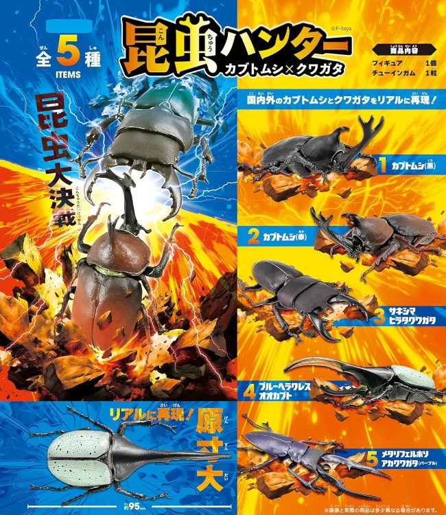 国内外のカブトムシとクワガタをリアルに再現! 1:カブトムシ(黒) 2:カブトムシ(赤) 3:サキシマヒラタクワガタ 4:ブルーヘラクレスオオカブト 5:メタリフェルホソアカクワガタ(パープル) リアルに再現!原寸大 内容商品 フィギュア1個 チューインガム1粒 1BOXで全5種類揃います。
