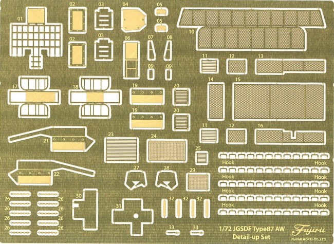 1/72シリーズのクオリティ・仕様が向上した設計スタイルにて製品化された87式自走高射機関砲(2両入り)にエッチングパーツが付属した製品です。 砲塔はスライド金型を用いた一体成形。 部品点数は109点で最小限にまとめつつ、再現性を重視すべき部分は別体パーツとしています。 車体の上側面および底面には実物にある溶接痕や滑り止め部分を的確に表現しています。 デカールにはマニアックな内容を収録。 ・車両番号、所属表記や部隊マークなど基本的な表記は「2高特」「7高連」「高射学校」「武器学校」と全部隊を網羅。 ・さらに高射学校の独特な二桁番号、千歳のC経路ジオラマを作りたくなる公道走行時の「追越注意」表記などを収録。 ・各駐屯地で観閲行進時に隊旗が掲げられた車両や、過去に特徴あるマーキングがされた車両を発発3/4連搭載車均等に収録。 ・インジェクションパーツでは表現しきれない繊細な箇所をエッチングパーツで再現しました。 より高度なディテールアップに役立ちます。 ・付属するグレードアップ用エッチングパーツは2両分で、選択の幅が広い内容豊富なエッチングパーツセットです。 ・エッチングパーツにはグリルメッシュ、後部バスケット、マッドガード、熱交換ベンチレーター、前照灯ガードなどを収録。 ・目立つところから細部までご利用はお好みで。 取捨選択の幅が広い内容豊富なエッチングセットです。 ・1/72スケールミリタリーシリーズNo.9陸上自衛隊87式自走高射機関砲のディテールアップに対応します。 特徴 ・35ミリ砲身のテーパー角、最大豊隆部分の位置など特徴を1/72では微細ながらも盛り込みプラパーツ化。 ・発発(発煙弾発射機)は前期型の3連タイプ、後期型の4連タイプが選択可能。 ・履帯は観閲式などでみられるゴムパッド付を再現しています。 ・レーザー測遠機や赤外線暗視装置は透明パーツ化 ・前照灯およびペリスコープは透明パーツ化 ・車体底面には操縦士非常脱出口や溶接痕など省略されがちな意匠も再現。 ・車体後部の牽引ワイヤーは塗装を考慮し別パーツとしています モニターや画像解像度の問題により、色の見え方が実際の商品と異なることが御座いますので、予めご了承ください。 (フジミ模型 ウェブサイトより)