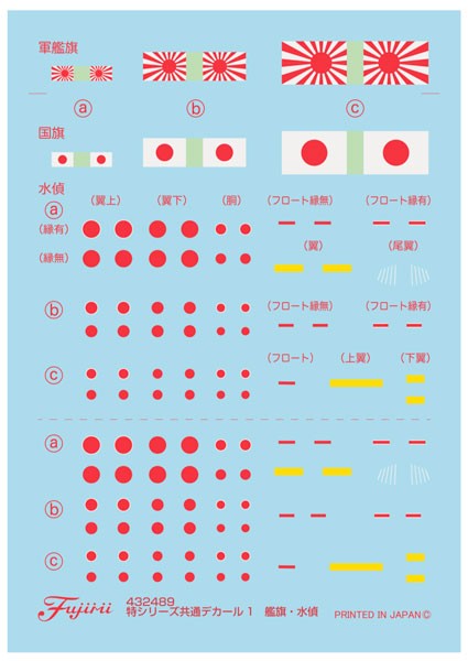 ・艦載機の日の丸、味方識別帯(黄帯)など収録し、日の丸は大戦後期の白縁がないものも含みます。