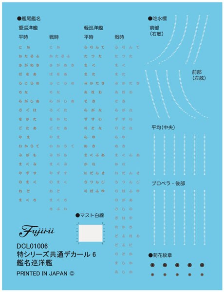 ・喫水表記や艦首の菊花紋章、艦尾の艦名表記(金色および軍艦色塗りつぶしの2種)を収録したデカール。