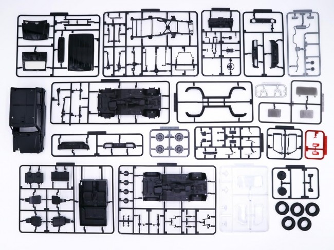 グリーン、イエローに続いて車NEXTシリーズのジムニーシエラにブルーイッシュブラックパール3が登場! (製品特徴) ・製品は2018年に発売開始されたJB74W-1~2型のJCグレードがモデル。 ・JCグレードは専用アルミホイール、ターンランプ付きミラーが特徴。 ・1/24スケールならではの大きさにより細部まで造形を的確に再現 (構造・仕様特徴) ・色分け済みパーツで構成しており、塗装しなくてもイメージするカラーリングが再現されます。 ・スナップフィット式の組立なので、接着剤を使わず組立てできます ・成形色は7種類で構成。(グロスブラック・フラットブラック・シルバー・ガンメタリック・クリアースモーク・クリアー・クリアーレッド) ・ストレート組立てでも着色パーツにより塗分けたようなビジュアル ・塗装の場合でもマスキング作業が大幅低減するパーツ分割 ボディ ・パーツカラーは専用の成形材を用いて塗装では表現が難しいレベルの艶を再現 ・ボディとルーフは別パーツ構成で、グロスブラックで成形。 ・ボディはスライド金型によるボックス形状で、スクエアスタイルを的確に再現 ・ジムニーシエラの特徴であるオーバーフェンダーは別パーツ化 ・ボンネット・リア・ルーフ等をボディパーツに積層はめ込みする車NEXTシリーズ定番の構造 ・ドアパネルなど凹モールドは塗装スミ入れにも対応できるようメリハリある深さで表現 ・オーバーフェンダーはサイドアンダーガーニッシュと一体化、成形色はフラットブラック ・フロントバンパー・リアバンパーはジムニー(JB64)に比べ幅広の専用パーツが付属 アンダーフロア ・下回りはラダーフレーム部を単独パーツとし、付帯部品を取り付けていく部品構造 ・リーディングアーム・トレーディングアーム、前後のデファレンシャルギアケースとドライブシャフトは別パーツとして立体化 ・トレーディングアームはジムニーシエラ専用パーツが付属 ・足回り形状は4AT車をモチーフに立体化 ウインド ・運転席/助手席ウィンドはガラスと枠を別体設計とし、シール彩色や塗装時のマスキングは不要 ・リアウィンド(サイド/リア)はスモーク色の専用成形でフロント側との色差を表現 ・リアガラスのデフォッガーは繊細な彫刻を施し表現 ・ワイパーアーム/ブレードは実物感あふれる繊細な細さの成形パーツ、ブレード表面の凹形状も細密彫刻で表現 インテリア ・ハンドルはJCの特徴を再現した専用パーツ ・ハンドルにはクルーズコントロール/オーディオスイッチが繊細な彫刻で表現 ・シートは座側/背面の両方の形状を再現するため2ピース構造 ・リアシートは背面の模様も彫刻再現し、ヘッドレストは下げ位置を再現 ・リアラゲッジボックス蓋にはスプリット模様を再現 装備品 ・ヘッドライトはJCのみ装備のLEDライトタイプの形状を専用パーツで起用 ・サイドミラーはターンライト埋め込み型のJC専用形状を再現 ・JCグレード専用のアルミホイールを起用、ガンメタリックの成形色でリアルに再現 ・タイヤはゴム質樹脂の成形品で専用金型を起用、195/80R15サイズのオンロードタイヤが付属 ・背面のスペアタイヤは4輪と同じゴム素材 ・後部灯火はクリアーレッド・クリアーの成形色パーツを積層して2色のライトレンズを再現 ・灯火はレフレクターの曲面やバルブも細やかに彫刻し表現 彩色シール ・付属するシールで細部の彩色を再現、切り抜き済みで簡単に貼ることができます ・シールにはメーターパネルやロゴ、車両ナンバーなどを収録。 ・ディスプレイモニターのシールは点灯・消灯状態の2種を収録し、お好みのシーンを再現できます。 ・ミラー部分は鏡面シールを貼り付けることでより実感的に再現することが可能です。 ・スペアタイヤハーフカバーデカールの「四駆」「ジムニー」を収録。 ・完成時サイズ:(約)全長150x全幅79x全高76㎜ 【付属内容】 ・ランナーx17 ・ゴム素材タイヤx5 ・組立説明書x1 ・シールx2 ※2025年11月時点の内容です。 モニターや画像解像度の問題により、色の見え方が実際の商品と異なることが御座いますので、予めご了承ください。 (フジミ模型 ウェブサイトより)