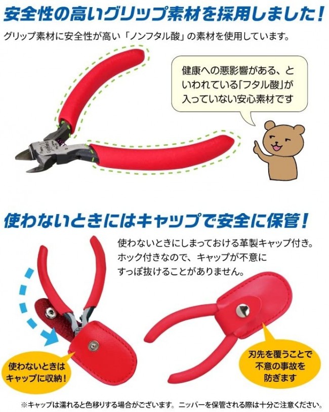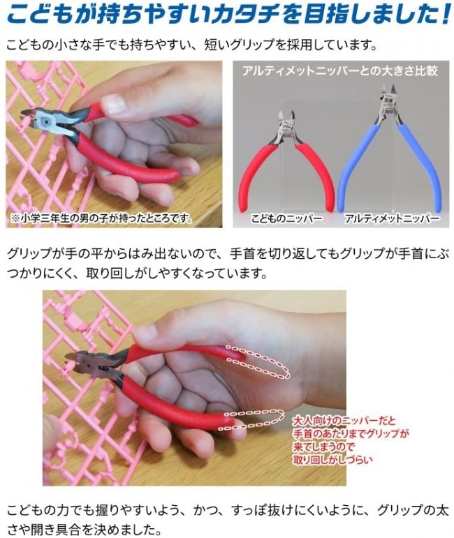 子供のことを本気で考えた使い勝手と安全性! 小さいけれどなめらかな切れ味でパーツの切り出しが楽しくなる! 子ども用に開発したプラモデル用ニッパー。 子どもが扱いやすい大きさと形状、安全性への配慮。 小さいけれどよく切れるニッパーです。 仕様・材質 ・材質:機械構造用炭素鋼(株)神戸製鋼所材使用 ・全長:約95mm ・重量:約50g ・刃部硬度:HRC58 以上 ・片刃仕樣 ・刃折れ防止ストッパー ・バネ付き ・ソフトグリップ 切断能力 ・対応素材:プラスチック(PS 樹脂、PP 樹脂、ABS 樹脂、PE 樹脂)のみ切断可。 ・切断能力φ3mm 以下の対応素材のみ切断可。 ただし透明・半透明のPS 樹脂は硬いため、φ2mm 以下に限定。(ゴッドハンド ウェブサイトより) います。
