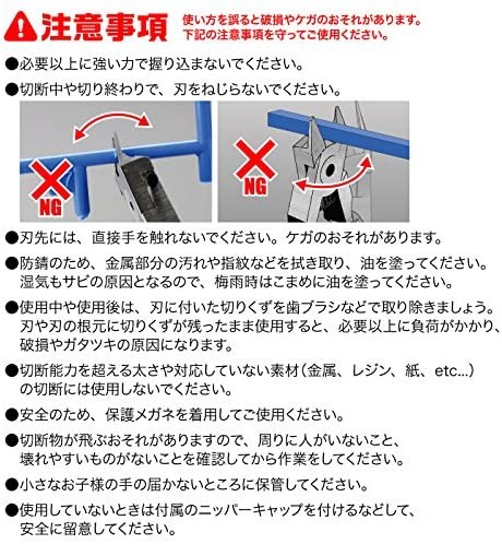 ブレードワンニッパーはアルティメットニッパー同様、プラモデルのゲートカットに特化したプラスチック専用片刃ニッパーです。 扱いやすさと切刃の耐久性を重視した設計となっており、薄刃ニッパーの入門にも最適です。 クリアパーツはφ2mmまでのゲート切断に対応することが可能です。 【各部の機能】 開き過ぎ防止ピン:刃の開き過ぎでバネが外れるのを防ぎます。 刃折れ防止ストッパー:力の入れすぎで刃が折れるのを防止します。 ※対応素材:プラスチック (PS樹脂、PP樹脂、ABS樹脂、PE樹脂)のみ切断可。 ※切断能力:3mm以下の対応素材のみ切断可。ただし透明・半透明のPS樹脂は硬いため、2mm以下に限定 ※切れ味を重視した繊細なニッパーですので、使い方を誤ると刃が欠けたり折れたりすることがあります。 ※取扱説明書の注意事項を守ってご使用ください。 [セット内容]本体、ニッパーキャップ