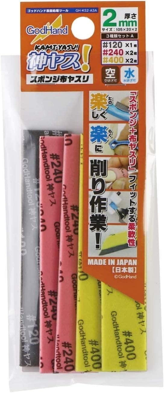 高耐久スポンジ布ヤスリ「神ヤス」のアソートセット 2mm、3mm、5mmが番手と枚数を変更して再登場 AセットとBセットに別れているので用途に応じて選べます。 神ヤス本体には新しく滲みづらいインクを採用しています。 ・厚さ:約2mm ・サイズ:約105×20mm ・番手:#120×1枚、#240×2枚、#400×2枚 ※仕様は予告なく変更になる場合があります。 (ゴッドハンド ウェブサイトより)
