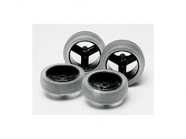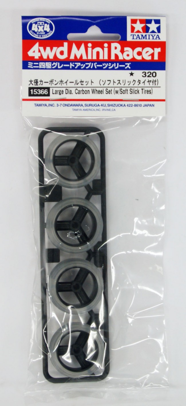強度の高いカーボンファイバーを配合したナイロン樹脂製大径ホイールに、ハイグリップなソフトスリックタイヤをセットしました。ソフトスリックタイヤは透明タイプ、ホイールはブラックカラー。前後2本ずつの1台分。大径タイヤを装備したミニ四駆PRO、レーサー、スーパーミニ四駆などに装着できます。