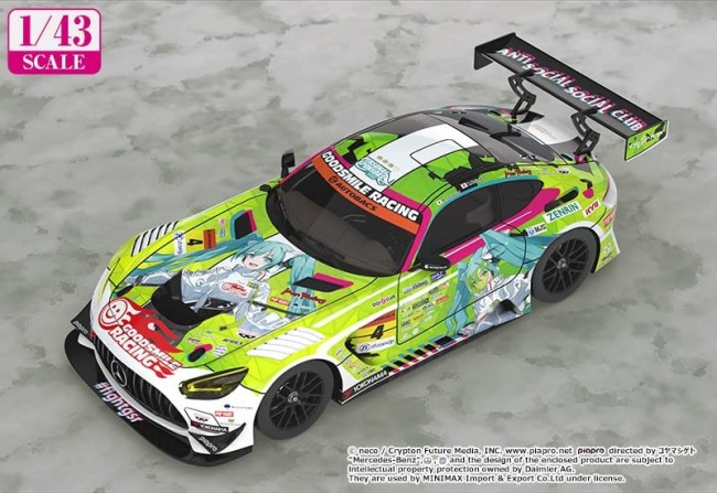 プラスチック製、又はレジン製レーシングカーモデル(完成品) (もしくはダイキャスト製 等) 待望のニューマシンが登場 2022年の『SUPER GT』GT300クラスに参戦するレーシングカー「グッドスマイル 初音ミク AMG」の1/43スケールミニカーが登場です。 neco氏による「初音ミク レーシングVer. 2022」を纏ったカラーリングを緻密に再現しました。 ボディの材質はレジン製。 レジン(PU)製塗装済み完成品ミニカー 1/43スケール 全長:約110mm 全高:約28mm 原型制作 MINIMAX ※掲載の画像は開発中のCGです。実際の商品は開幕戦仕様のデザインに反映されたものになります。 掲載の写真は実際の商品とは多少異なる場合があります。 (グッドスマイルカンパニー ウェブサイトより)