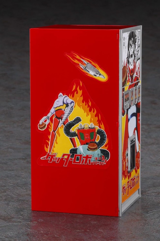 ゲッターロボ(漫画版)とレトロ自販機が激アツコラボ! 「ゲッターロボ」のイラストやロゴマークを配した オリジナルデザインの「ハンバーガー」自動販売機をキット化。 自販機の正面&両サイドにメカやキャラクターのイラスト、 作品ロゴを配したデザインとなります。 パーツカラーはレッド、ライトグレー、クリアーの3色。 組み立ては接着剤不要。 商品取り出し口が可動。 ハンバーガーの箱が2個付属します。 シール ・ゲッターロボイラスト ・ロゴ ・スイッチ類 他 [プラモデル][限定品][新シール] スケール … 1:12 品番 ……… SP667 模型全高 … 150mm 模型全幅 … 72.5mm (C)Go Nagai・Ken Ishikawa/Dynamic Planning (ハセガワ ウェブサイトより)