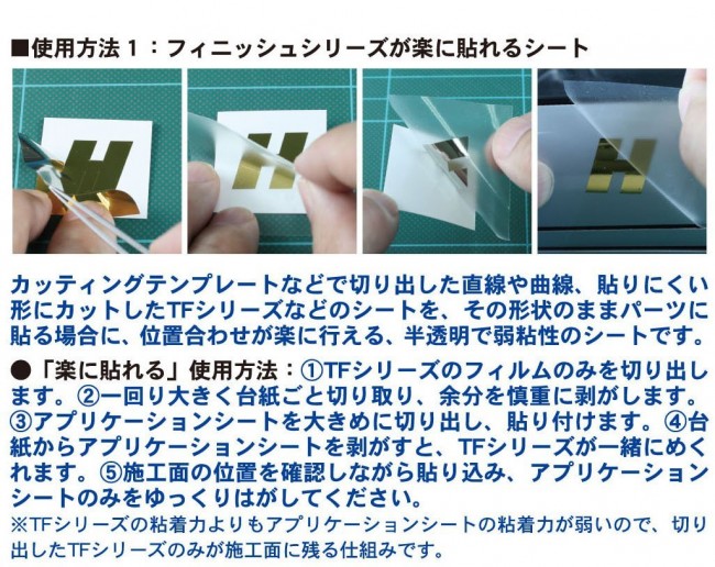 模型作りに適した極薄の糊を、台紙とペットフィルムでサンドイッチした、両面粘着シートです。糊の成分はフィニッシュシリーズと同等で、台紙からはがした後に約24時間で固着します。