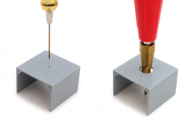 プラスチック製組立モデルのパーツや、板状の材料に丸穴を加工するのに便利なステップドリルとハンドルのセットです。