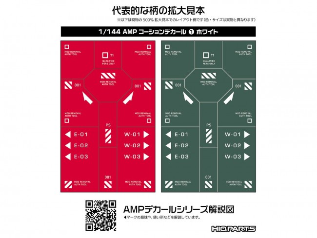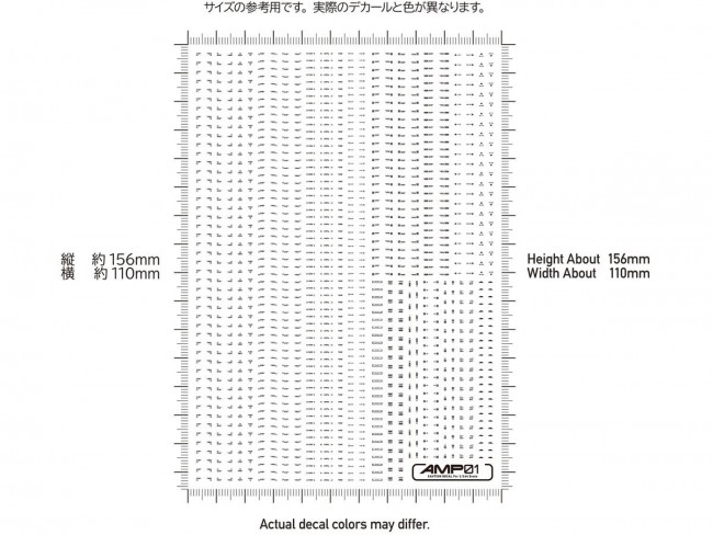 デカールまでこだわりたい人へ! 極小サイズクラスのデカールが作品の精密感をアップ!! メカモデル向けの水転写式汎用コーションデカール「AMP」は、近年の細分化されたメカモデルのパーツ割に対応するため、デザインを刷新した新シリーズです。 装飾を削ぎ落としたスタンダードなデザインが中心で、作品の精密感と情報量を高めます。 ある程度の可読性を確保しているため、ブログの文字解説を参考に、最適な貼り付け場所を選定してください。 極小サイズながらも高精細な印刷が施されており、モデルのスケール感を損なうことなく細部を彩り、模型の持つ魅力を最大限に引き立てます。 また、光沢仕上げの際にクリアコート層の濁りが目立ちにくい「研ぎ出し対応」のグロスデカールです。 AMPコーションデカール01: 「01」は汎用性が高く、使用頻度の高い柄を多く収録しています。 AMPコーションデカール02: 「02」は汎用性が高く、かつアクセントが大きい柄を多く収録しています。 「01」と合わせて使います。 AMPコーションデカール03: 「03」は中型と長文のマークを収録。 「01」、「02」と合わせて使用します。 AMPコーションデカール04: 「04」は大型と数字入り、長文のマークを収録。「01」、「02」、「03」と合わせて使用します。 デカールの文字やデザインの解説記事はこちらで公開しています。 https://hiqparts.info/amp-ref 水転写式デカール サイズ/110mm x 156mm 生産国/日本製